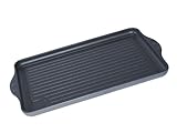 The pressure cast non stick 17 by 11-inch extra thick oversized commercial cast aluminum double grill has a deep ridged cooking surface that sears foods evenly and allows drippings and fat to collect away from your food in the side well channel.
